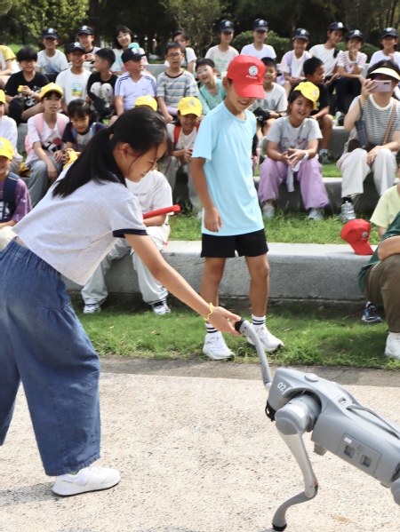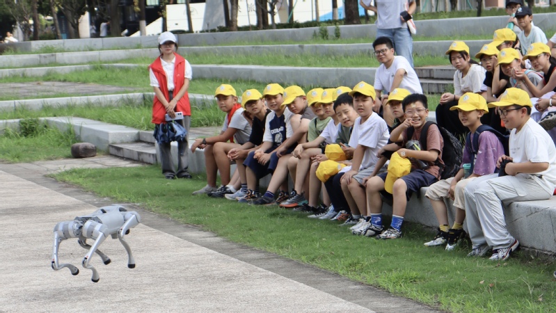 研学活动首站,户外表演区便点燃了同学们的热情。随着主持人一声令下,造型帅气的机械狗率先登场,在操控下完成奔跑、跳跃、转身等一系列流畅动作,还不时摆出可爱姿势与同学们互动,引得现场掌声连连。