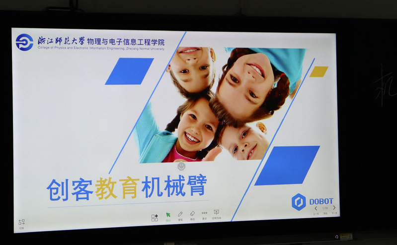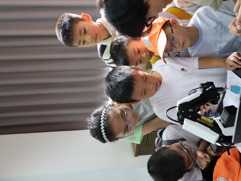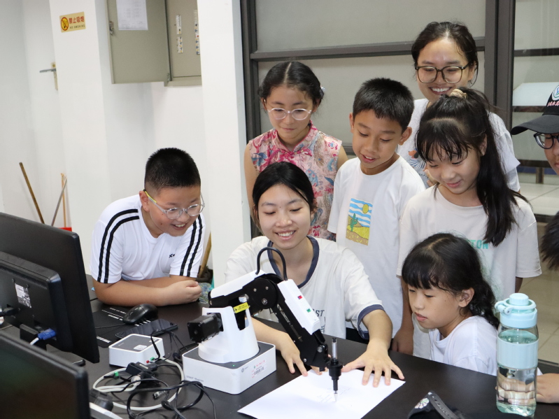 离开户外场地,同学们走进专属课堂,开启科技实操体验。在机械臂操作区,大家围在设备旁,认真聆听志愿者同学讲解操作要点,随后亲手操控摇杆,指挥机械臂完成抓取、移动的动作,从生疏到熟练,每一次成功都让同学们露出自豪的笑容。