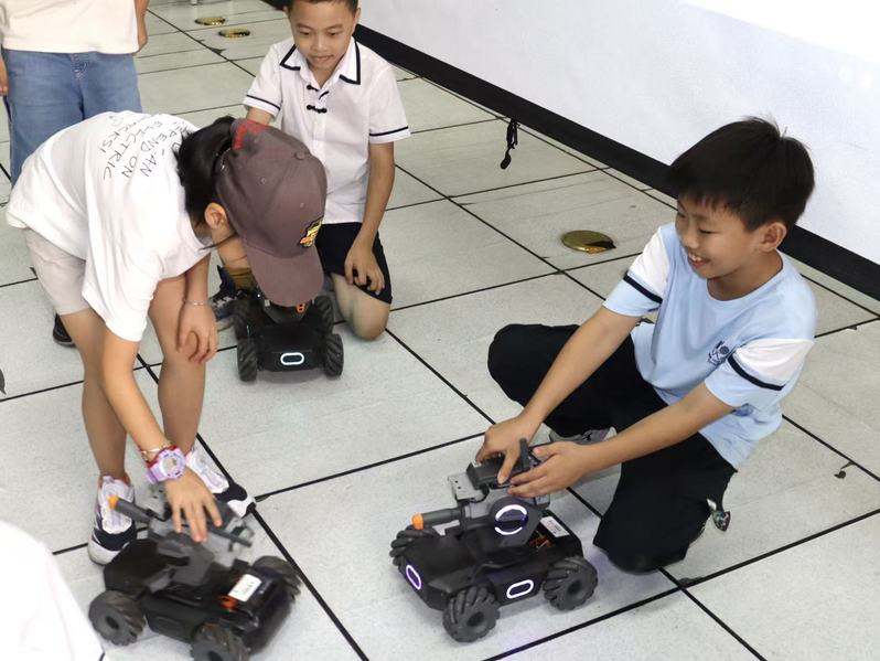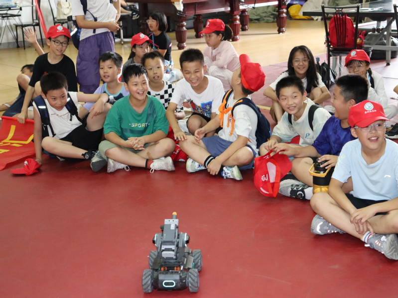 机甲战车体验区同样人气爆棚。同学们自觉排队,轮流坐进操控位,手握遥控器控制战车前进、后退、转弯在亲手操控中感受机械运动的原理,也培养了手眼协调与临场反应能力。这堂实操课,让抽象的科技知识变成了可触碰、可操作的乐趣,激发了大家对科技实践的浓厚兴趣。