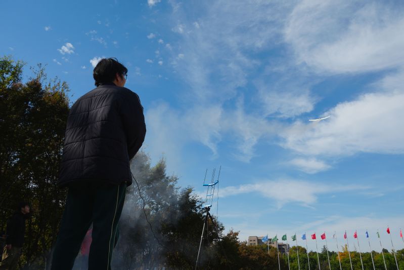 “火箭推进”压轴登场——“三、二、一,点火!”随着一声令下,来自枫叶高中的同学按下了点火按钮,一道白烟腾空而起,航模型如离弦之箭直冲云霄。点燃的不只是火箭,更是同学们心中的航天梦想!