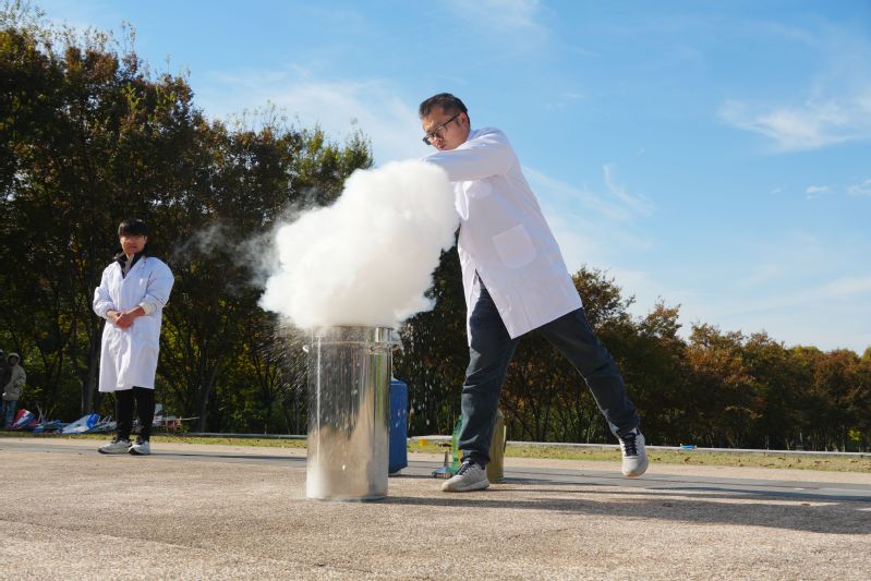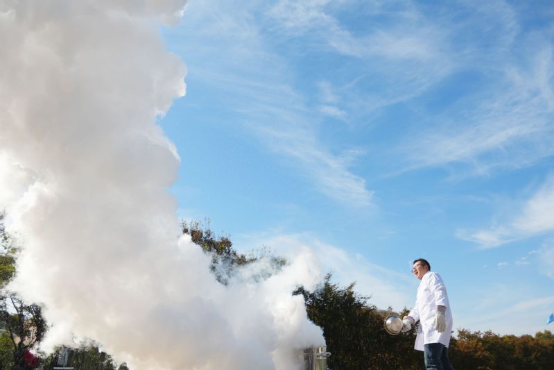 “冷热对流”紧随其后——这是一场冷与热之间的较量。100℃的热水与-196℃的液氮相遇,会擦出怎样的火花?只听“砰”的一声巨响,白烟翻腾而起,引得同学们阵阵惊叹。